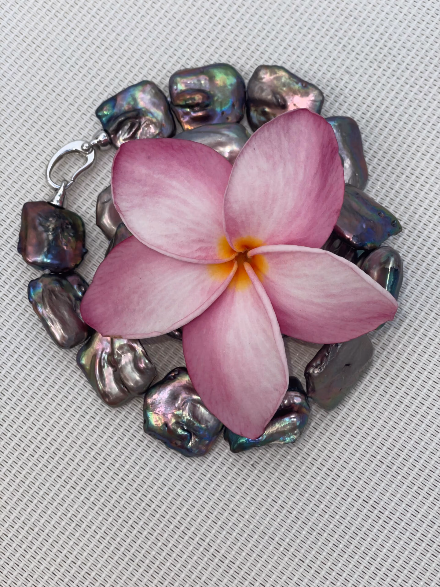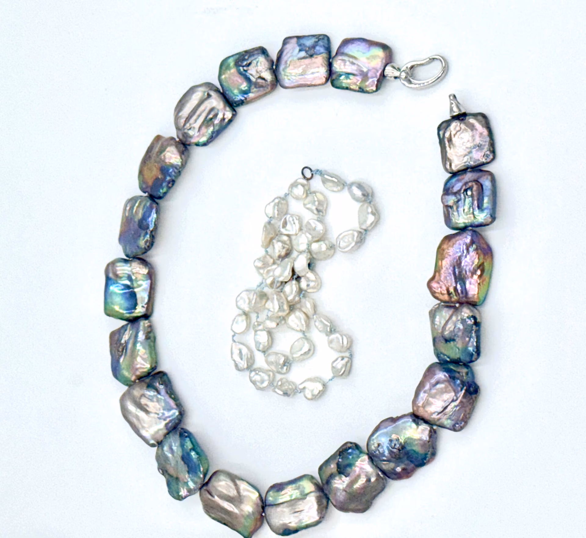 20mm square Baroque freshwater pearl necklace. Large sterling silver clasp that you can put a charm on.